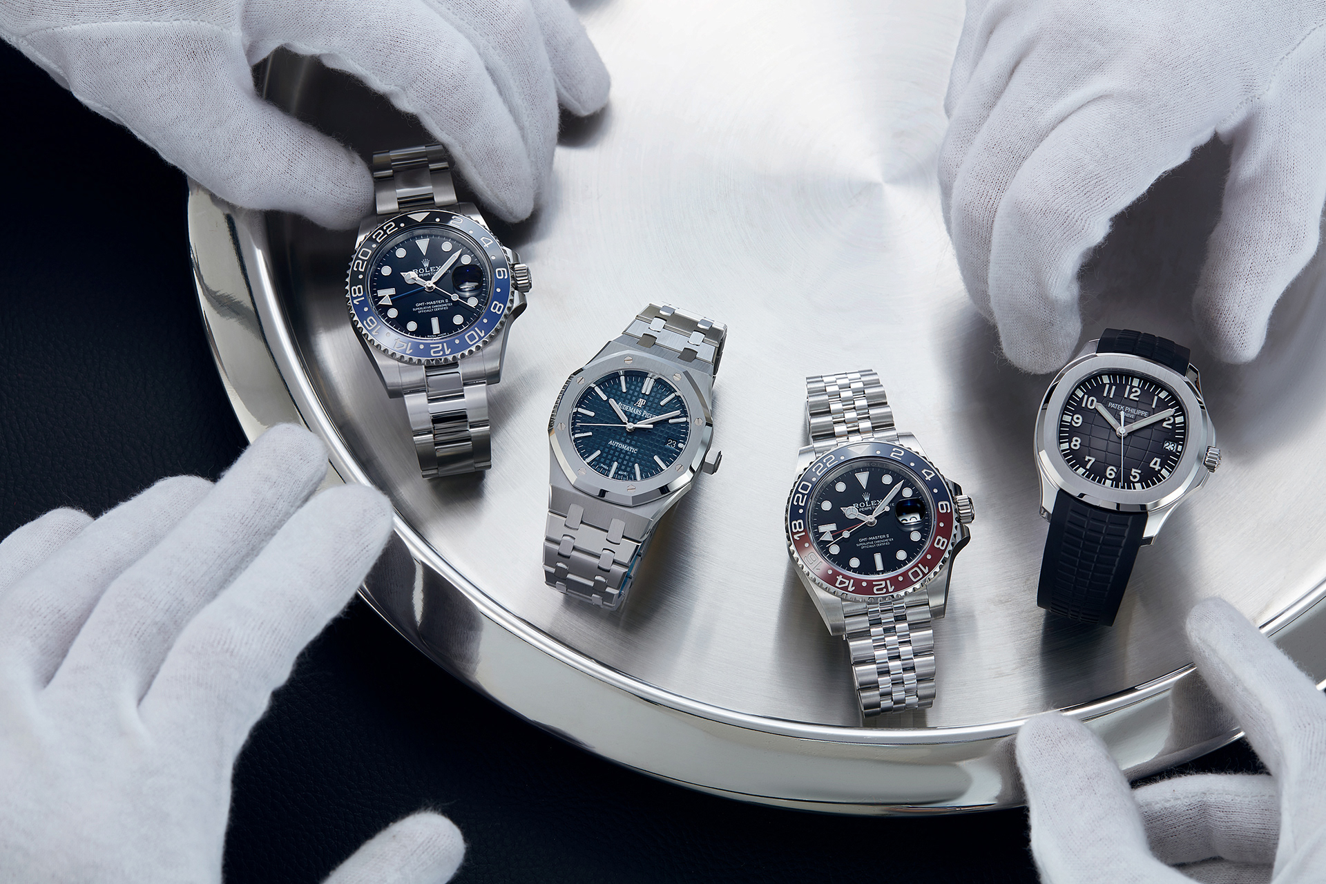 produktfotografie von drei rolex luxusuhren auf einem tablett getragen von einem pagen